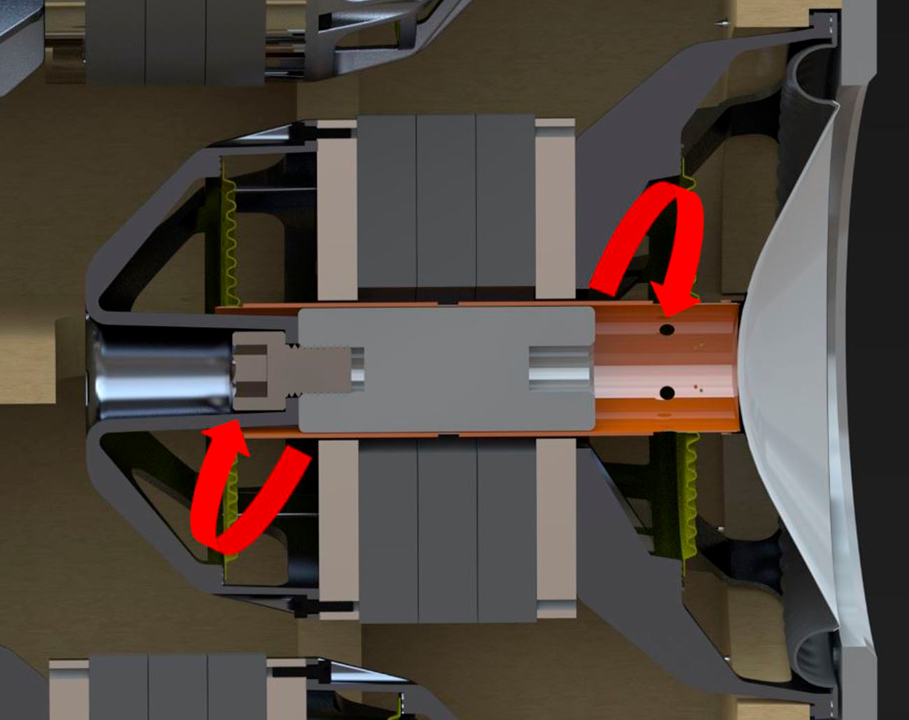 また、このような長いボイスコイル構造を安定させるために、ボイスコイルの両端に2つのスパイダーを使用しています。