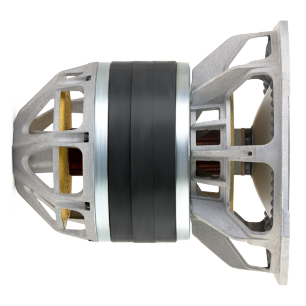 目的は、歪みのないウーファーのストロークを増やすことです。 しかし、歪みや高熱、高出力時の故障が発生しやすい長いボイスコイルを1個使用するのではなく、2個のボイスコイルを背中合わせにして使用しています。しかし、それらは逆方向に巻かれています。 電子機器の差動回路のように、これにより、すべての音量で、特に高出力でのウーファーのコモンモード歪みやその他の非線形性が排除されます。その結果、私たちのウーファーは、より大きなウーファーよりも高出力で、歪みが少なく、機械的にも熱的にも信頼性の高いウーファーとなっています。