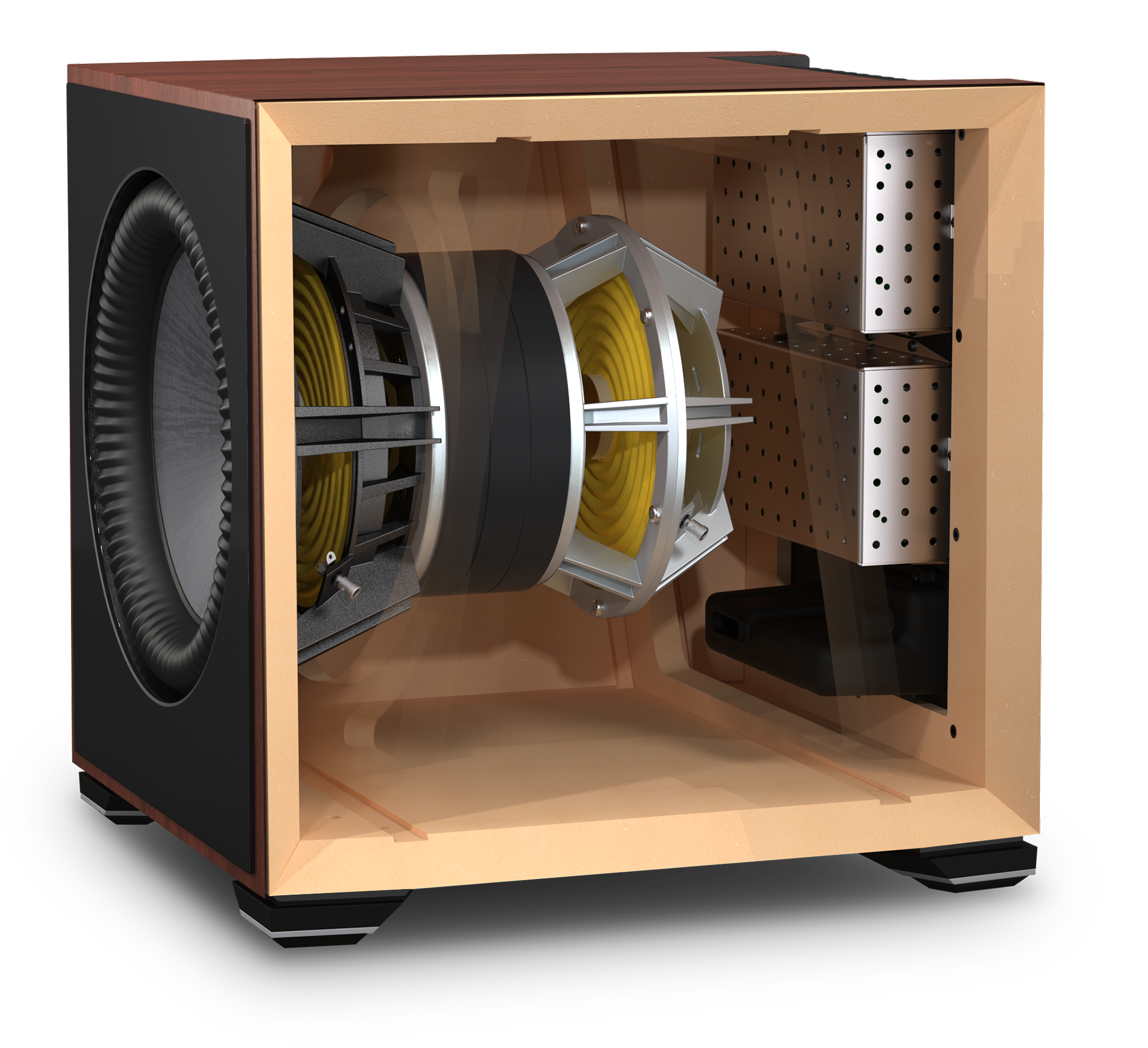 カスケード・フュージョン・ブレースは、キャビネットの剛性をさらに高めて音響精度を最大化すると同時に、定在波を内部で分散させることで、精度と低音の明瞭さを向上させます。