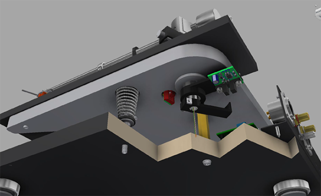 プラッターベアリング自体は、ベースプレートに対して方向を変えながら細いスチール糸でテンションをかけられ、モータープーリーとプラッターベアリングの間に軸の正確な延長を形成します。これによりプラッターにかかるモー ターの駆動力によるサブシャーシのぐらつきがなくなり、プラッターはピストンのような上下運動のみになるので、レコード溝内の音楽をトラッキングしながらも、トーンアームやスタイラスを乱すことのない動きを実現しています。